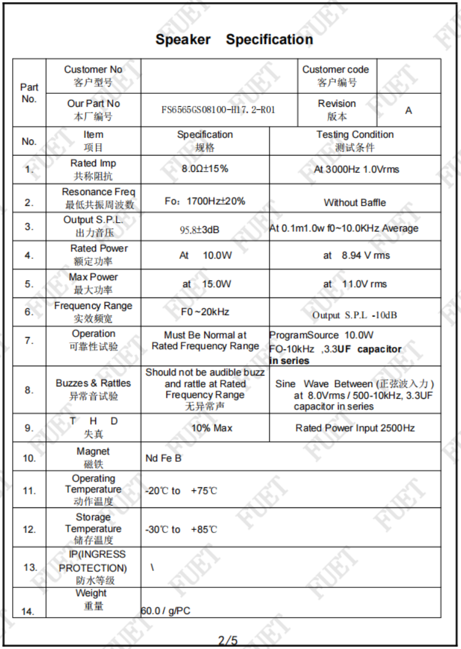 | 阻抗 | 8.0Ω±15% | At 3000Hz 1.0Vrms |