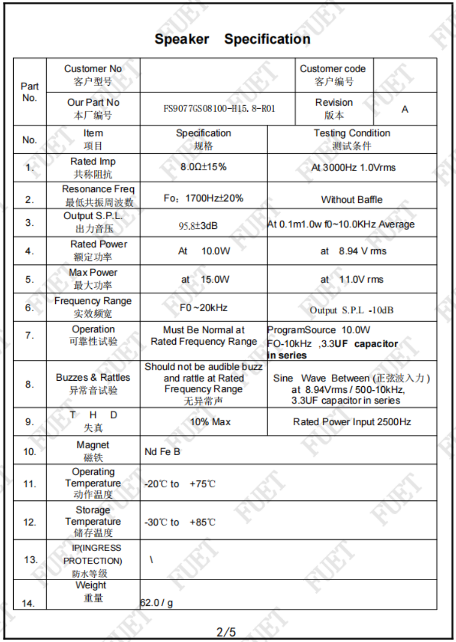 最低共振周波數 Fo:1700Hz±20% Without Baffle